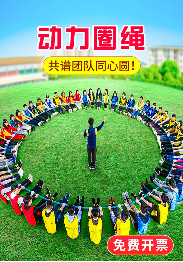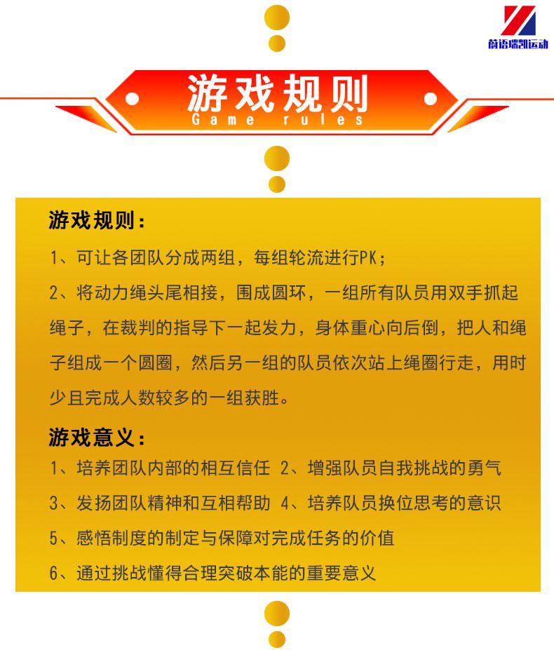 名称:动力圈 性质:团队合作项目 道具:静力绳或拔河绳,手套 人数:10人以上,人数不限,根据人数使用相对应长度的绳子即可。 任务:全体成员拉起绳子,一起坐下,一人挑战在绳上行走一圈或正时针摇绳达到一定的数量。 注意事项 1、有严重腰椎颈椎、 心脏问题的不适宜参与。 2、学员在绳圈上行走时,助教需要在学员旁保护其不摔倒在地。 3、地面上的学员会齐力向外保证绳圈一直处于紧绷状态,以免绳子松软导致学员行走时出现安全问题。