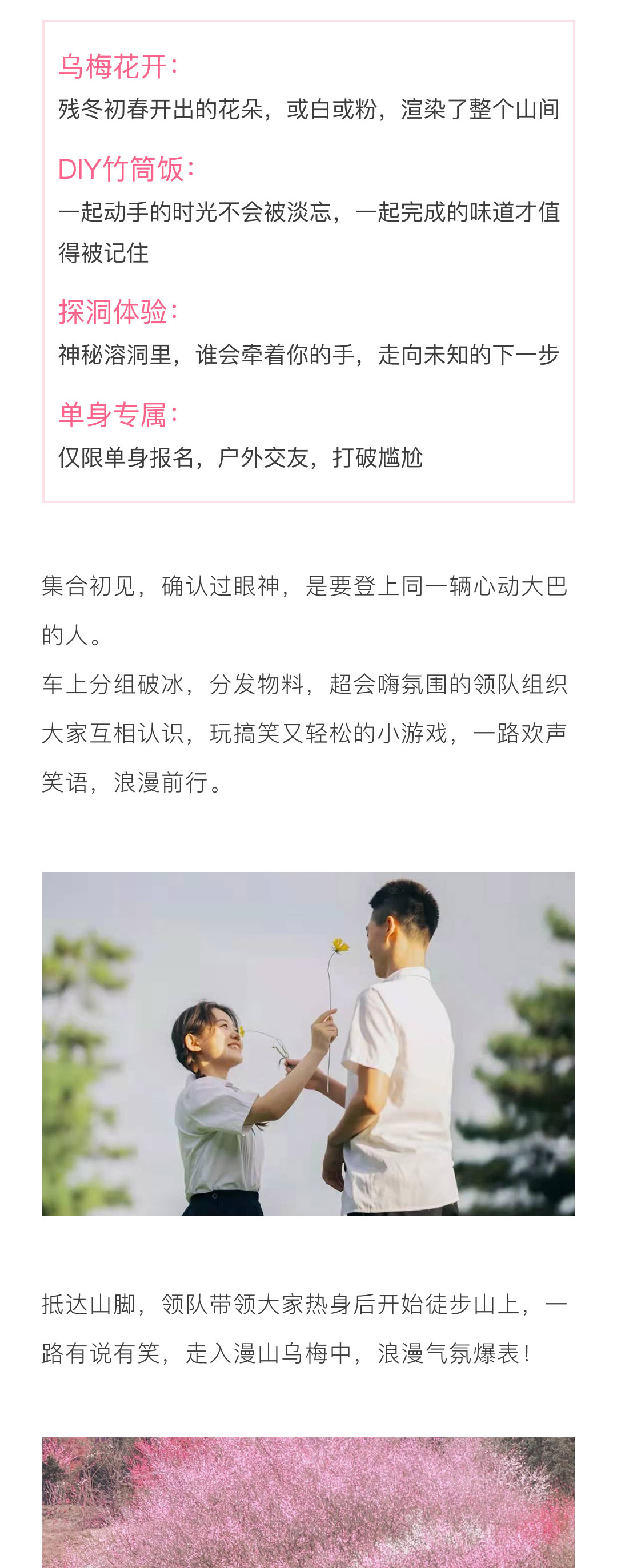 休闲交友,赏花玩乐; 乌梅花开,DIY竹筒饭,神秘溶洞,心动游戏,交友脱单; 精品联谊,邂逅心动,名额有限,先到先得哦! 旅行主题:单身旅行主题; 景观亮点:乌梅花开,神秘溶洞,心动游戏; 参团客群:20-48岁渴望爱情的单身男女; 团队人数:15人起成团,低于15人此团自动解散,所支付费用自动返回原账户; 集合解散:全国出发,全国散团; 特别告知:本产品全程纯玩无购物; 支付方式:在线支付+团上现付,详情请查看“费用包含”栏。