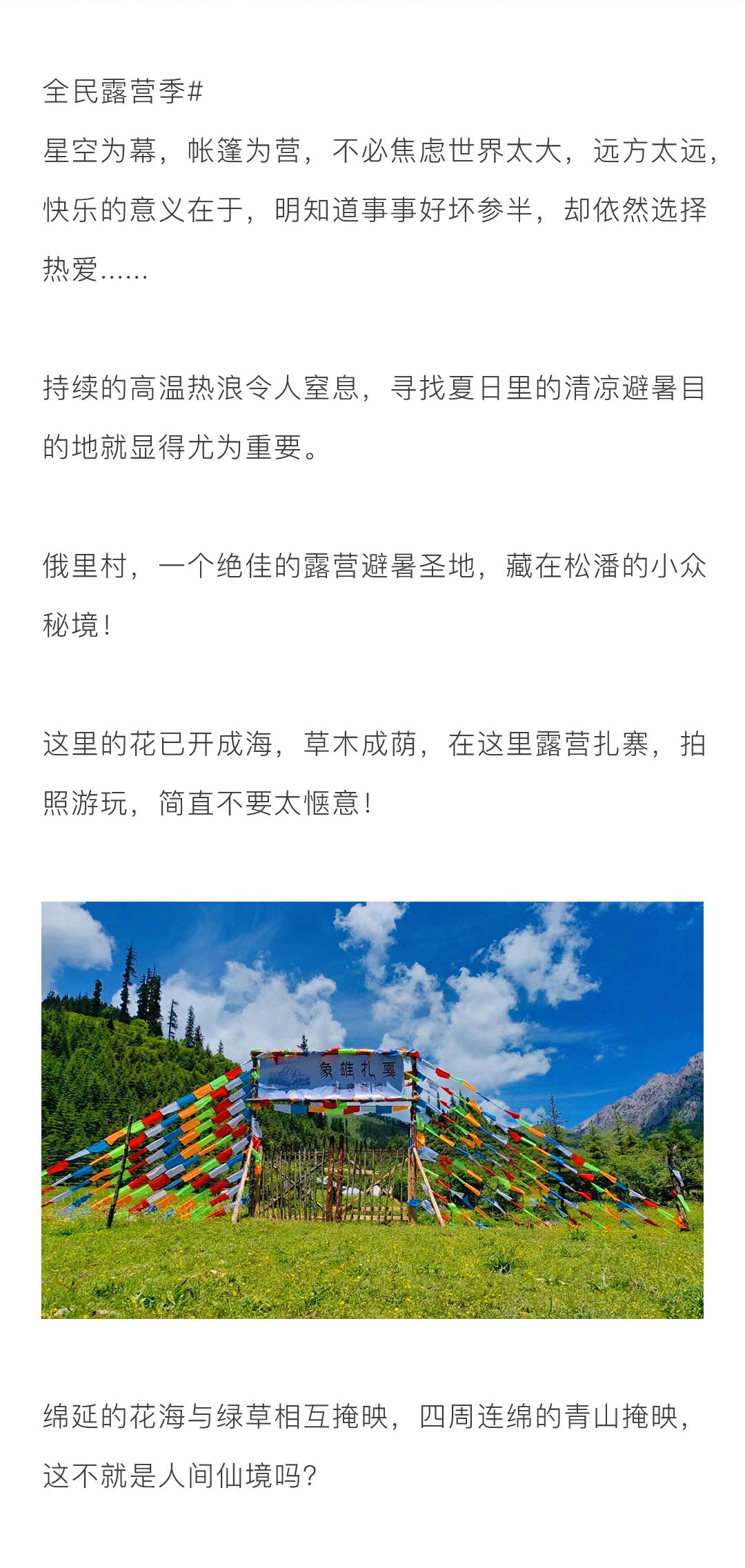 持续的高温热浪令人窒息,寻找夏日里的清凉避暑目的地就显得尤为重要。 俄里村,一个绝佳的露营避暑圣地,藏在松潘的小众秘境! 这里的花已开成海,草木成荫,在这里露营扎寨,拍照游玩,简直不要太惬意! 旅行主题:闺蜜游主题; 景观亮点:户外徒步,星空露营,特色美食,篝火晚会,骑马旅拍; 参团客群:中青年旅游爱好者; 团队人数:4人起成团,低于4人此团自动解散,所支付费用自动返回原账户; 集合解散:全国出发,全国散团; 特别告知:本产品全程纯玩无购物; 支付方式:在线支付+团上现付,详情请查看“费用包含”栏。
