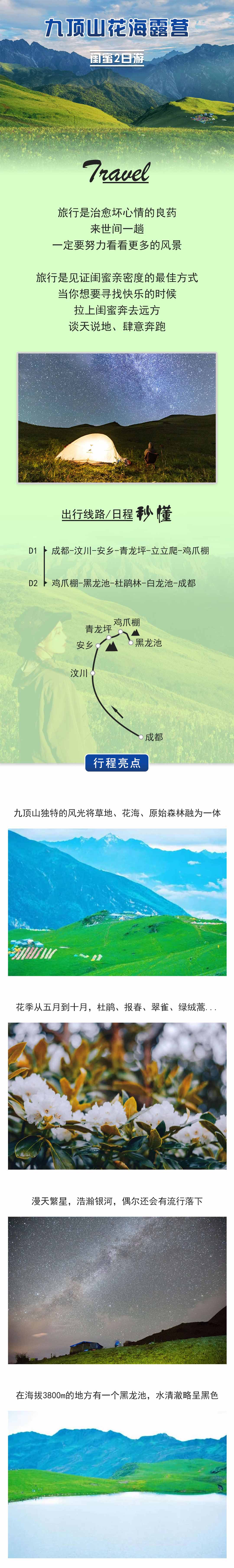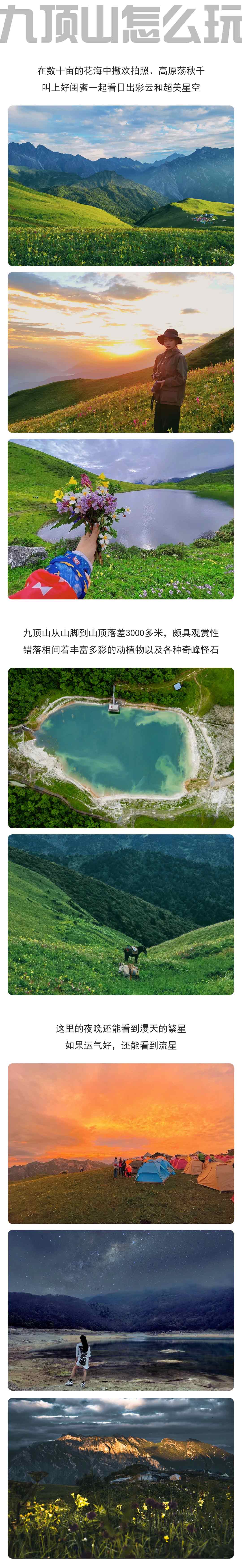 有没有一个地方适合闺蜜一起去玩?要求:时间短、路程近,有花海、有湖泊,能看云海、星空、雪山......这里就是九顶山!最适合闺蜜、小姐妹一起拍拍拍的地方! 九顶山花海是川西最富盛名的“空中花园”,每年夏季都是徒步者、赏花爱好者的出行首选! [产品性质]本产品适合18-39岁喜欢户外旅行的闺蜜、朋友参与拼团 [付款方式]线上支付+团上现付(详情查看“费用说明”栏) [成团须知]12人起成团 [行程亮点]草原花海、原始森林、高山湖泊 [集合解散]全国出发,全国散团 [特别告知]本产品属于户外徒步产品,真纯玩无购物。