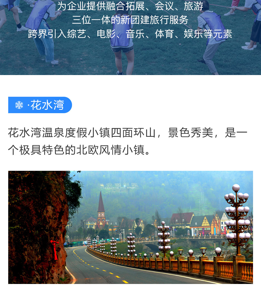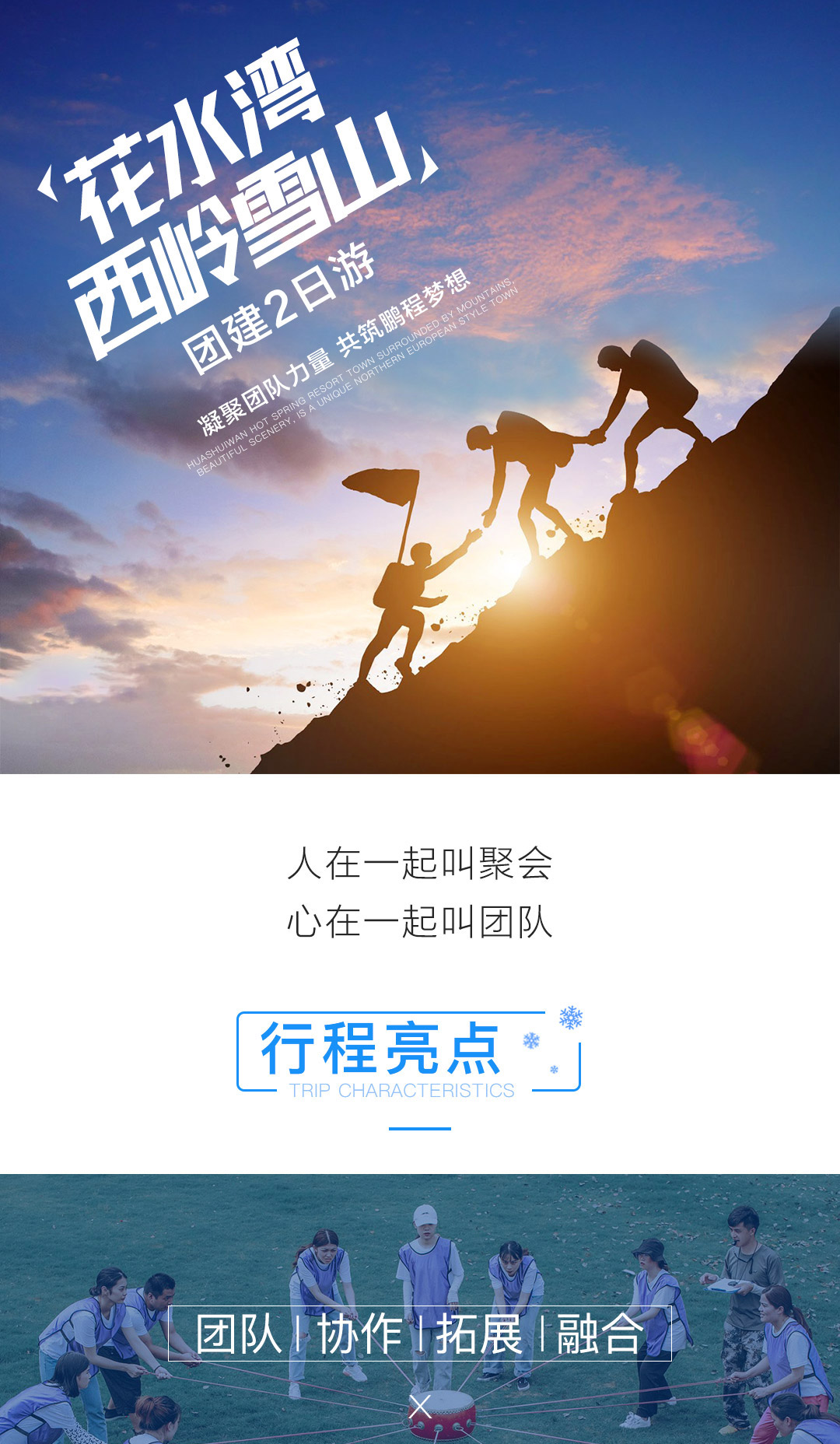 远离城市喧嚣,择一处小镇幽居,赏大雪纷飞,看云卷云舒,这才是团建的最佳目的地。 旅行主题:团建旅行主题; 景观亮点:暖冬温泉,冰雪活动,趣味团建; 参团客群:企业等团队出行; 团队人数:12人起成团,低于12人此团自动解散,所支付费用自动返回原账户; 集合解散:全国出发,全国散团; 特别告知:本产品全程纯玩无购物; 支付方式:在线支付+团上现付,详情请查看“费用包含”栏。