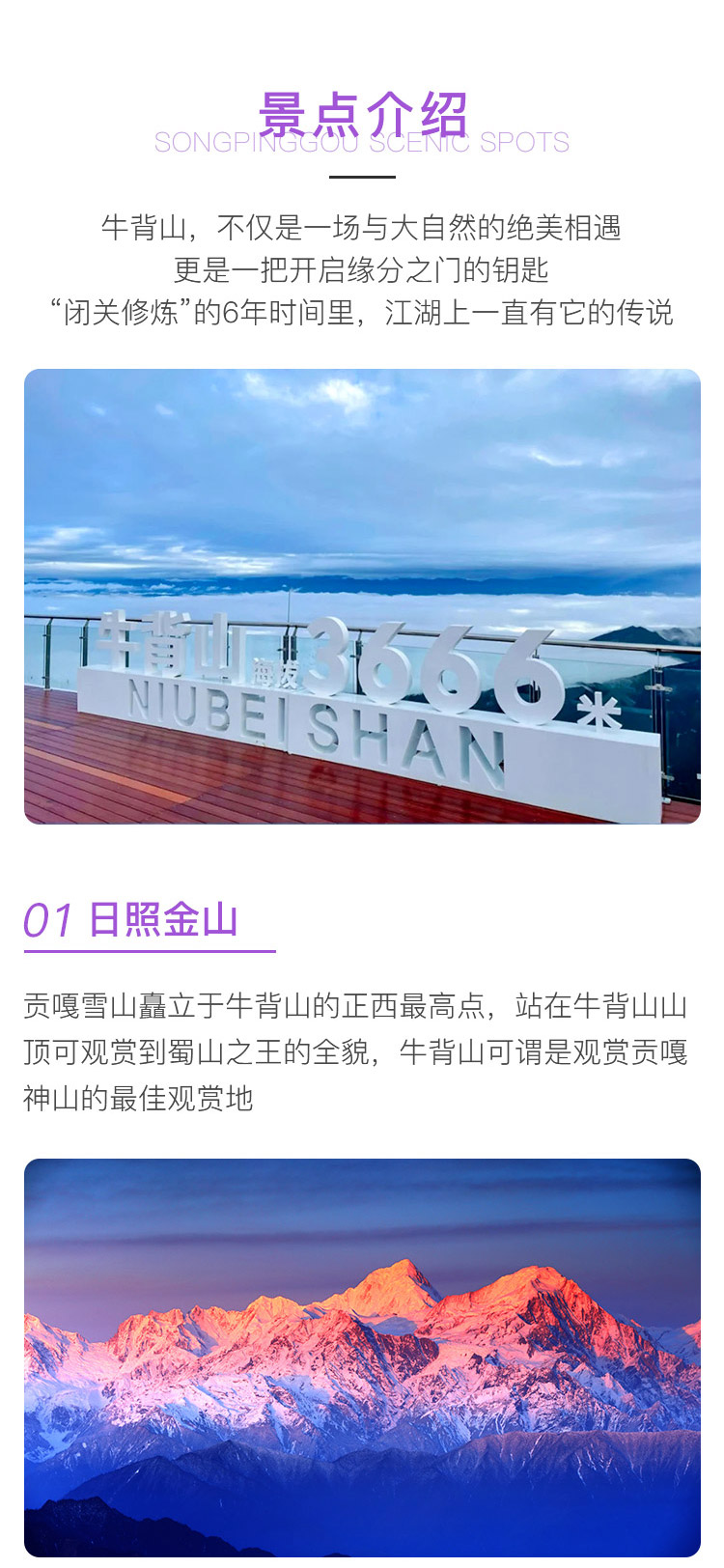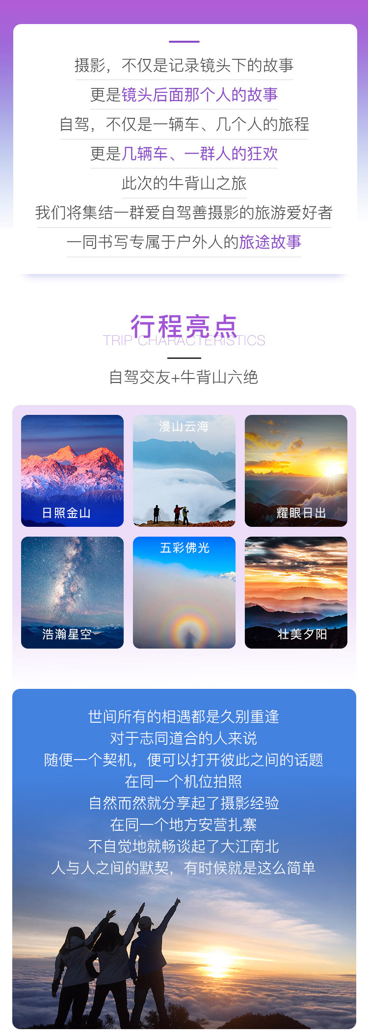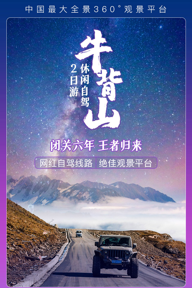 牛背山,中国最大全景360°观景平台,它“闭关修炼”的6年时间里,江湖上一直都有它的传说。 旅行主题:户外旅行主题; 景观亮点:日照金山,佛光,云海,日出,星空; 参团客群:中青年旅游爱好者; 团队人数:14人起成团,低于14人此团自动解散,所支付费用自动返回原账户; 集合解散:全国出发,全国散团; 特别告知:本产品全程纯玩无购物; 支付方式:在线支付+团上现付,详情请查看“费用包含”栏。